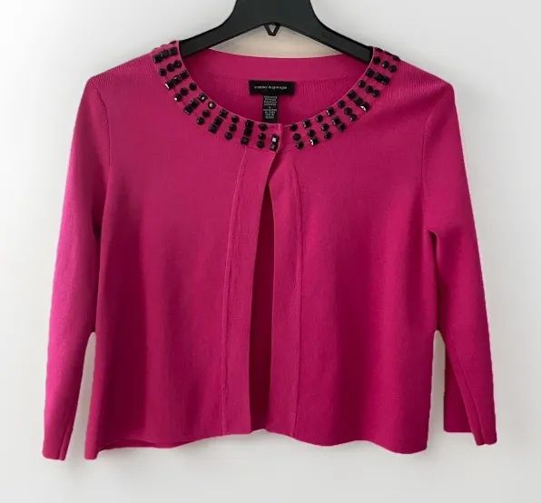 Beaded Embellished Cardigan Sweater Women’s Size L Large EUC excellent Open Front, 3/4 sleeves, semi-cropped, hook eye single closure at neck. Fine stretch knit in Fuchsia Magenta Hot Pink with Black onyx beaded rhinestone embellishment at neckline (looks like maybe one bead is missing at closure, but it doesn’t stand out). Tags: cocktail, modern, statement, contemporary, artsy, feminine, businesswear, office, careerwear, dressy, evening, night out Nylon viscose blend Machine wash P2P 18.5” Length 20.5”