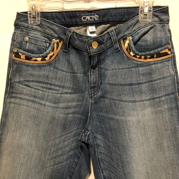 CACHE DENIM METAL POCKET CORNER STUD EMBELLISHED KISSED WITH ANIMAL PRINT ON FRONT POCKETS SLIGHT F... Show more