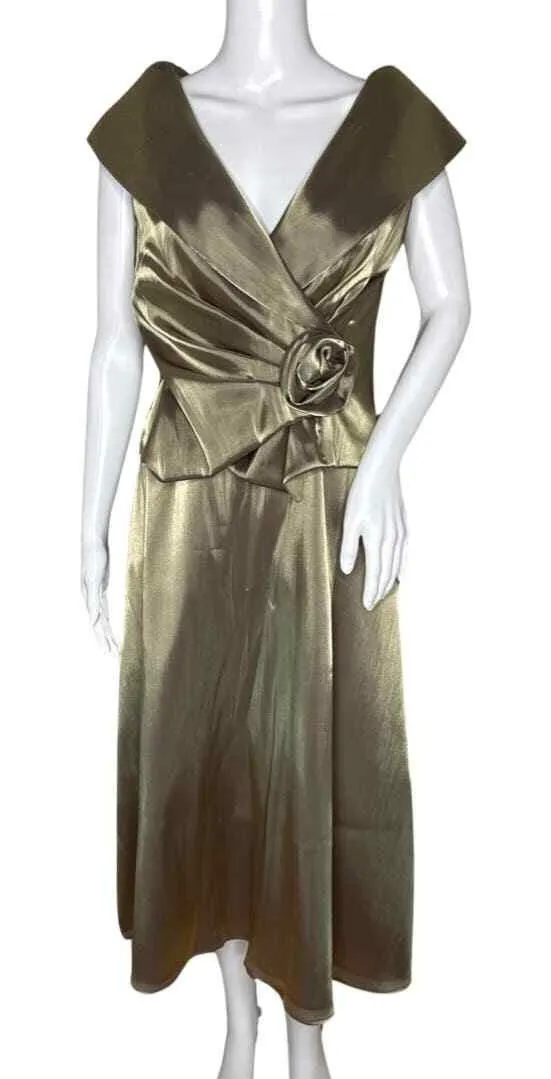 Women's Size 4 y2k, 90s, old hollywood, glam, shimmer, metallic, mob wife, red carpet, wedding guest, cocktail, formal, evening, rosette, floral, portrait collar, pleated, ruched, hourglass, classic, elegant, bridesmaid, gala, special occasion, mother of the bride, vintage glam, sirencore, homecoming, party, silky, iridescent, bronze, earth tones, Mother of The Bride/Groom Measurements are Approximate: Length 45" Armpit to Armpit 17" Waist 29" A Couple of Flaws in the Fabric on Collar, Please See Photo. Otherwise Pre-owned in excellent condition unless otherwise stated. Please see photos for condition, measurements and details. Please Verify Measurements. (4315)