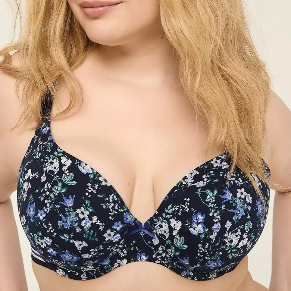 Coverage & Lining: Medium coverage Lightly lined Straps & Hooks: Adjustable straps Hook-and-eye closure Fabric & Details: Breathable cotton-blend fabric Just-right coverage perfect for low-cut tops and all-day support U-back to help reduce bulges for a smooth silhouette Comfortable and supportive wings without boning Hidden underwire design Molded cups Item Number #355898 Imported Plus Size Bra Cacique Intimates Hand Wash 92% Cotton/8% Spandex