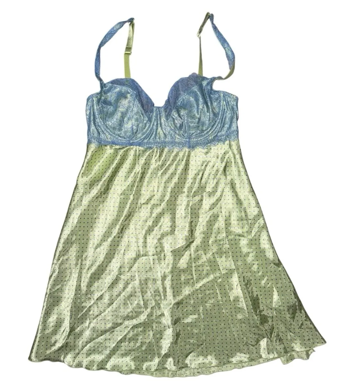 Cacique green blue bow slip dress nightgown nighty lace polka dot y2k Size 14/16 women’s vtg vinta... Show more