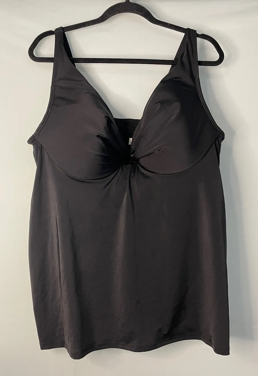 A black tankini swim top from Cacique Swim offering both style and support. This top features a plunging neckline with a subtle twist detail at the bust and built-in bra cups for shaping and lift. The tummy control design provides a flattering silhouette. Adjustable straps ensure a comfortable and customizable fit. Perfect for beach vacations or poolside relaxation. **Top only** Measurements: • Band Size: 42 in • Cup Size: DD Type: Tankini Department: Women Material: Polyester, Spandex Blend Features: Adjustable Strap, Built-In Bra, Padded, Tummy Control Swim Top Style: Tank Pattern: Solid Cup Size: DD Accents: Strap Strap Type: Wide Strap Number of Pieces: 1 Piece Country of Origin: Vietnam Keywords: tankini, swim top, plus size, tummy control, bra support, plunging neck, adjustable straps, beachwear, resort wear, poolside, vacation, supportive, flattering