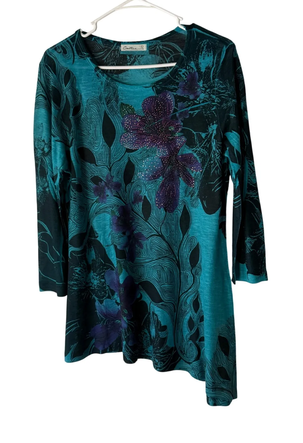 Cactus Teal Floral Rhinestone Detail Long Sleeve Asymmetrical Top Boho Artsy L Type: T-Shirt Department: Women Style: Tunic Material: Polyester Blend, Polyester, Nylon Neckline: Round Neck Sleeve Length: Long Sleeve Sleeve Type: Classic/Fitted Sleeve Accents: Rhinestone Pattern: Floral Theme: Bohemian, Floral, Unique Design, Casual Chic Features: Lightweight Fit: Regular Keywords: tunic top, floral print, rhinestone, asymmetrical, long sleeve, teal top, purple flowers, women's top, casual top, bohemian, Cactus brand, unique top