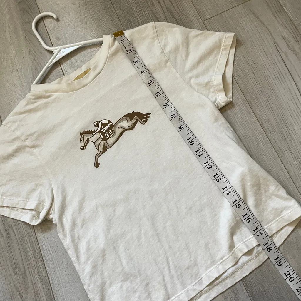 Cafe de La Horse Crop Top in the color Cream. Crew neckline, short sleeve, crop length. Horse racing, equestrian graphic on front. Lightweight, breathable, stretchy fitted fabric. Size large, womens. In great pre-worn condition, no major issues. 100% cotton. Made in USA. Super cute minimalist, casual, sporty, preppy, equestrian, heritage, casual everyday wear. //B690, 3.0