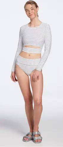 The Calia by Carrie Underwood Striped Cut-out Long Sleeve Rash Guard in size Small is a stylish and functional swim shirt designed for women. Made from a blend of nylon and spandex, this rash guard features a white striped pattern with cut-out accents and long sleeves, making it perfect for beach days or water activities. The CALIA brand ensures high quality and attention to detail, making this rash guard a must-have for any beach enthusiast looking for a fashionable and practical swim top. Like new condition Runs true to size Pit to pit: 17”
