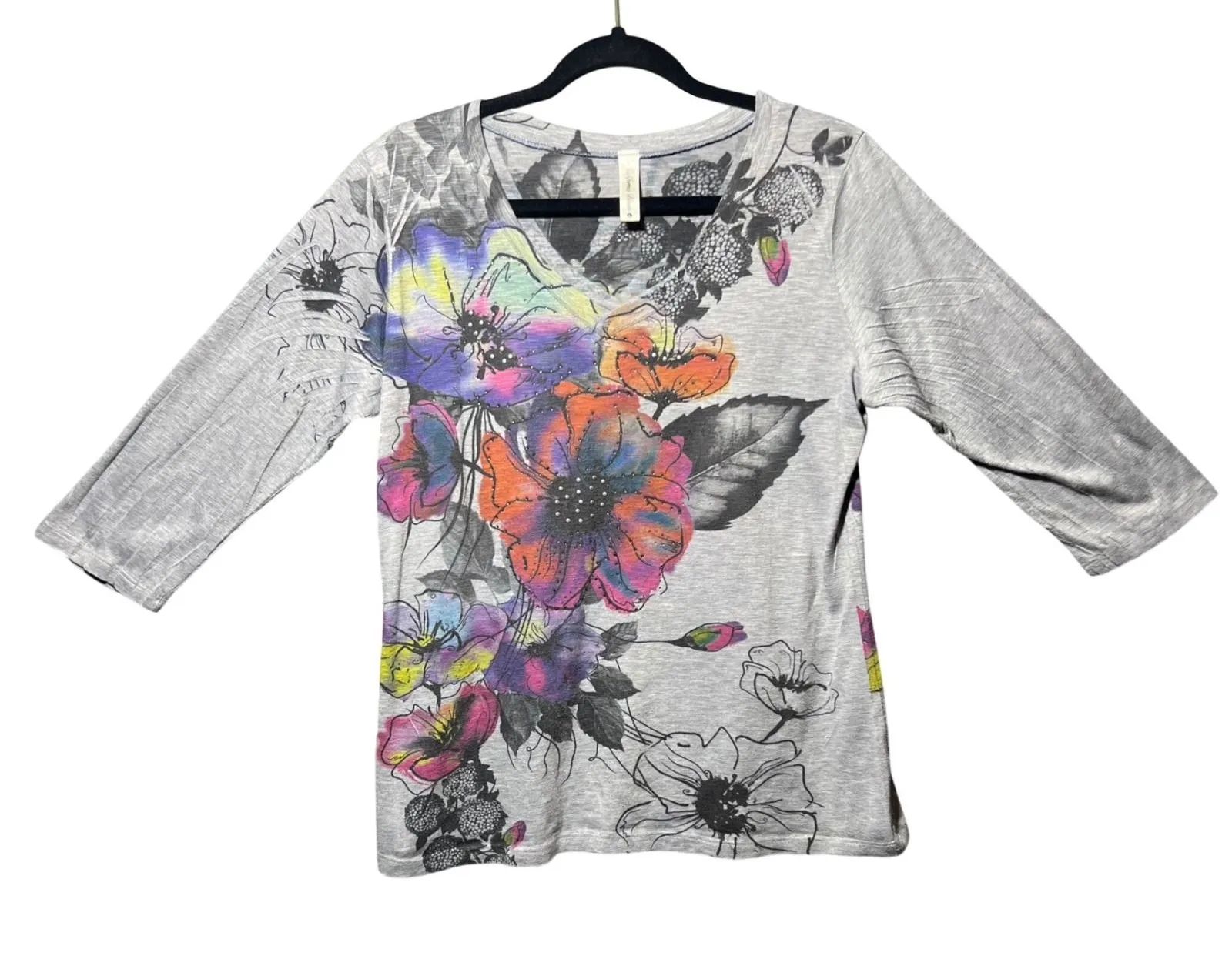 California Bloom women's graphic t-shirt in size large. This top showcases a vibrant floral print with colorful blooms and scattered detailing. It features a flattering V-neckline and stylish 3/4 length sleeves. The design incorporates both colorful printed flowers and outlined floral elements, with subtle embellishments adding texture and shine. Keywords: graphic tee, floral blouse, 3/4 sleeve, v neck shirt, colorful print, apparel, summer top, spring fashion, women's casual, bloom design, embellished shirt, statement top Note: All items are pre-owned with minor wear expected. Major flaws shown. Measurements are approximate.