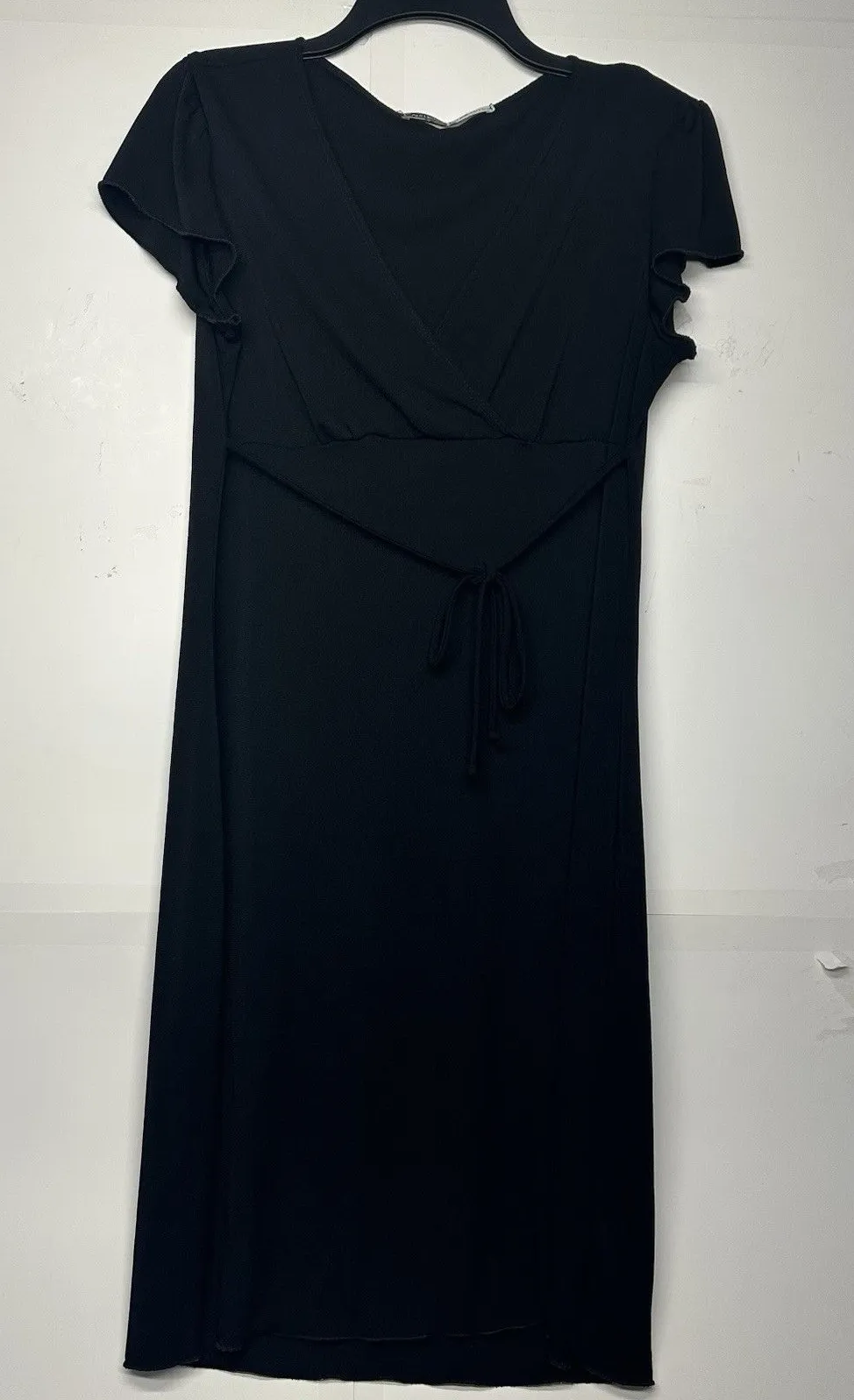The California Concepts Black Wrap Dress in women's size medium features a solid black color with a V-neckline and short sleeves. This knee-length dress is made of a knit fabric, making it lightweight and stretchy for comfort. Perfect for travel, parties, or casual wear in the spring, summer, or fall, this dress is easy to care for with machine washable instructions. The bohemian style adds a trendy touch to this versatile piece by California Concepts. The pit to pit is 19 inches and the shoulder length down is 40 inches it does have a imperfection on the shoulder