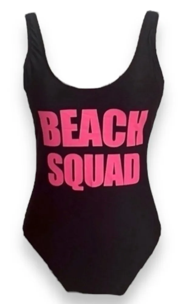California Sunshine Beach Squad One Piece Swimsuit Black with Hot Pink Beach Squad Lettering Size... Show more