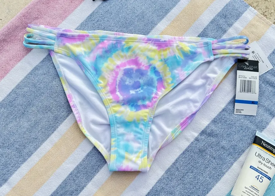 Women's Yellow Tie Dye Stretch Lined Strappy Moderate Coverage Hipster Swimsuit Bottom Brand: California Waves Details: Strappy sides , Moderate Coverage Material: Nylon Condition: New with Tags Care instructions: Hand Wash Measurements: 16in waist, 9.5in rise Hygiene Liner is intact Material: 82% Nylon, 18% Spandex, lining is 100% Polyester All orders are shipped within 1-3 business days, Bundle and Save