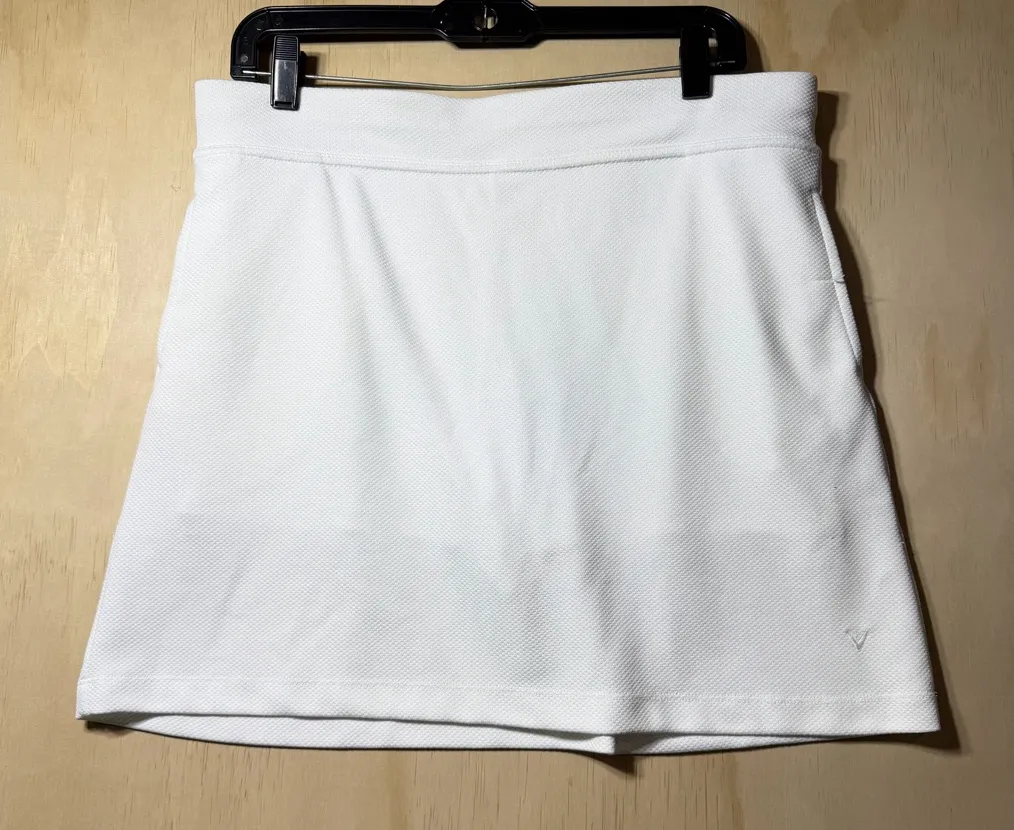 This Callaway women’s golf skort is the perfect blend of performance and comfort. Designed in a crisp white textured knit, it offers great stretch, breathability, and mobility—ideal for the course, the range, or active everyday wear. The skort features a clean pull-on waistband, subtle Callaway “V” logo at the hem, and built-in shorts for comfort and coverage. Made with high-quality performance fabric that allows for easy movement while maintaining a polished look. This skort is in excellent pre-owned condition with no stains, tears, or flaws noted. ⸻ ✨ Features • Brand: Callaway • Women’s Size: Large (L) • Color: White • Pull-on waistband • Lightweight & breathable • Stretch performance fabric • Built-in shorts (skort style) • Side pockets • Subtle embroidered Callaway V logo • Made in Vietnam ⸻ 📏 Measurements (from your photos) Measured flat, approximate: • Waist: ~16” • Length: ~16.5”