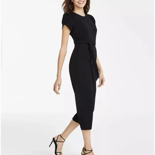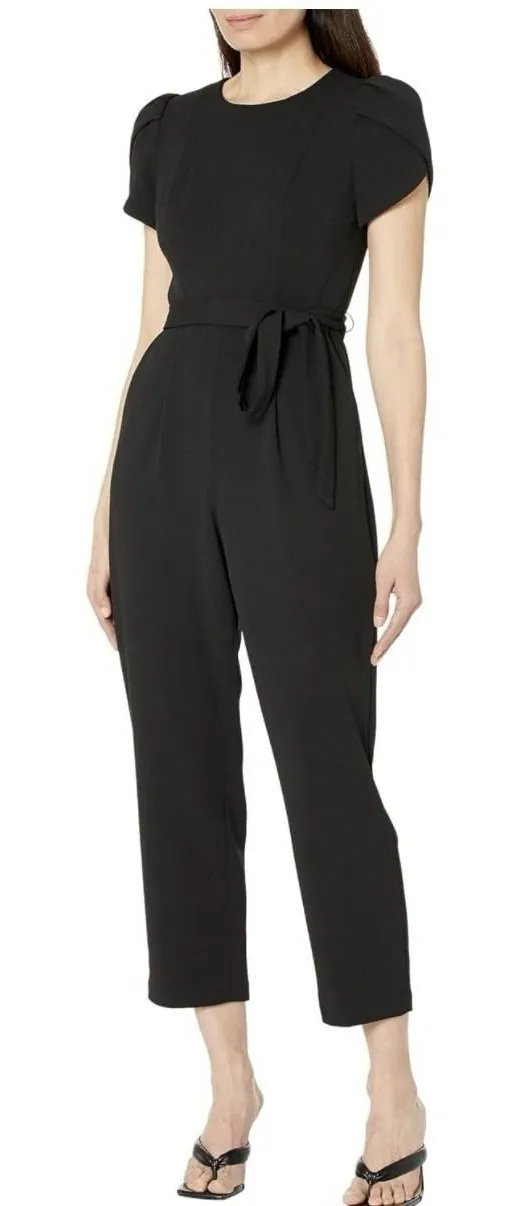 Stretch crepe fabric Tulip sleeves Side pockets Gold tone Back zip closure Self tie belt Polyes... Show more