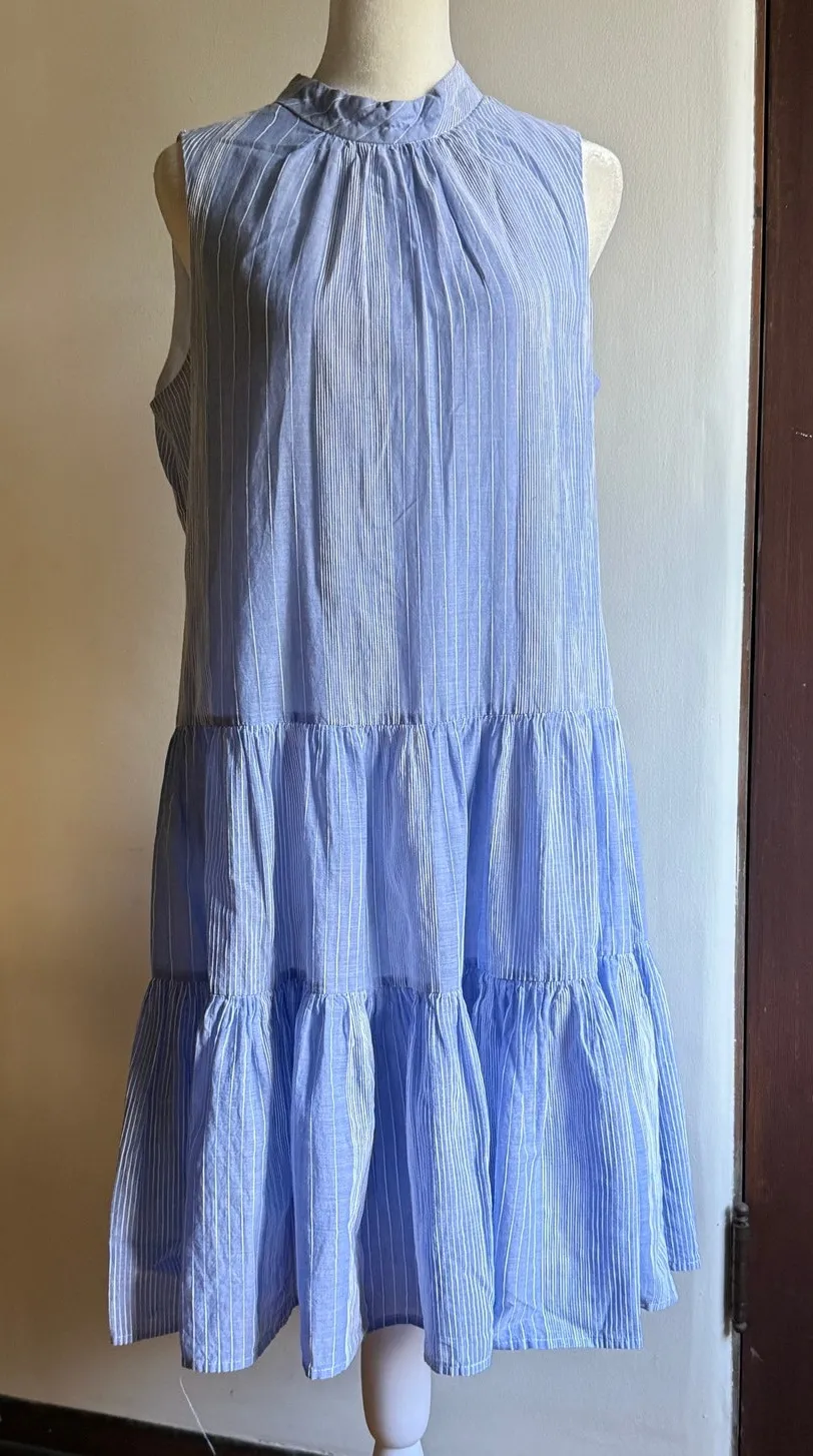 CALVIN KLEIN | Blue and White Cotton Striped Tiered Mock Neck Tie Back Dress 100% Cotton Fully lin... Show more