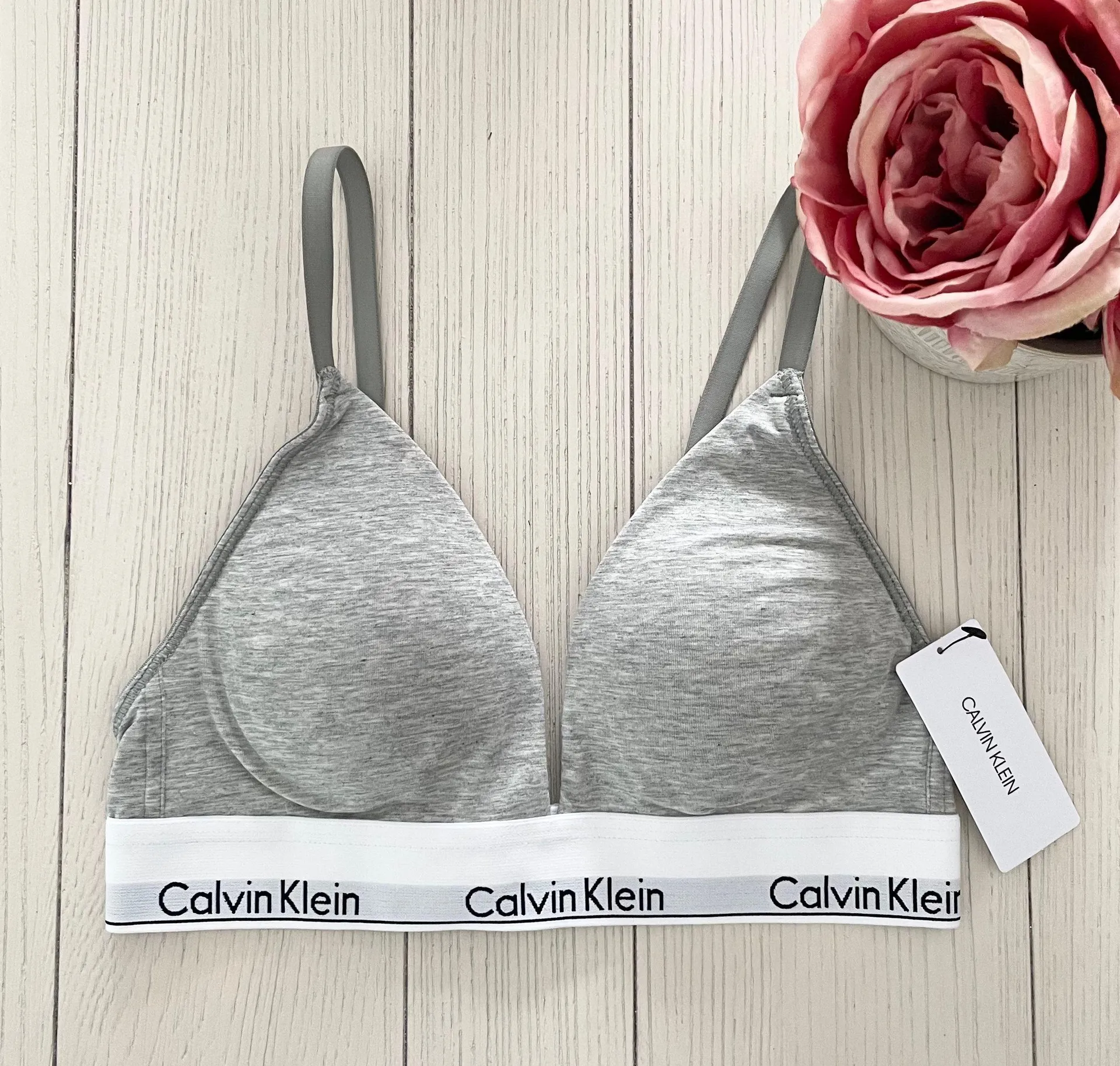 Calvin Klein Bralette, new with tags size XS. Gray triangle bra with logo band Light padding with re... Show more