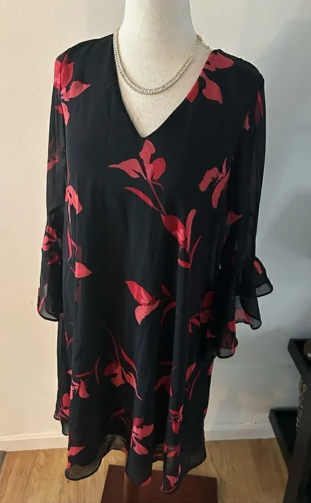 Calvin Klein flower dress black and red with ruffle around sleeves size 8 No belt G471