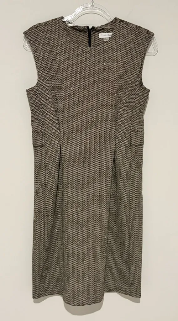 Calvin Klein Dress tweed lurax Sheath Ponte midi sparkly dress black tan size 4. Dry clean. Pleated... Show more