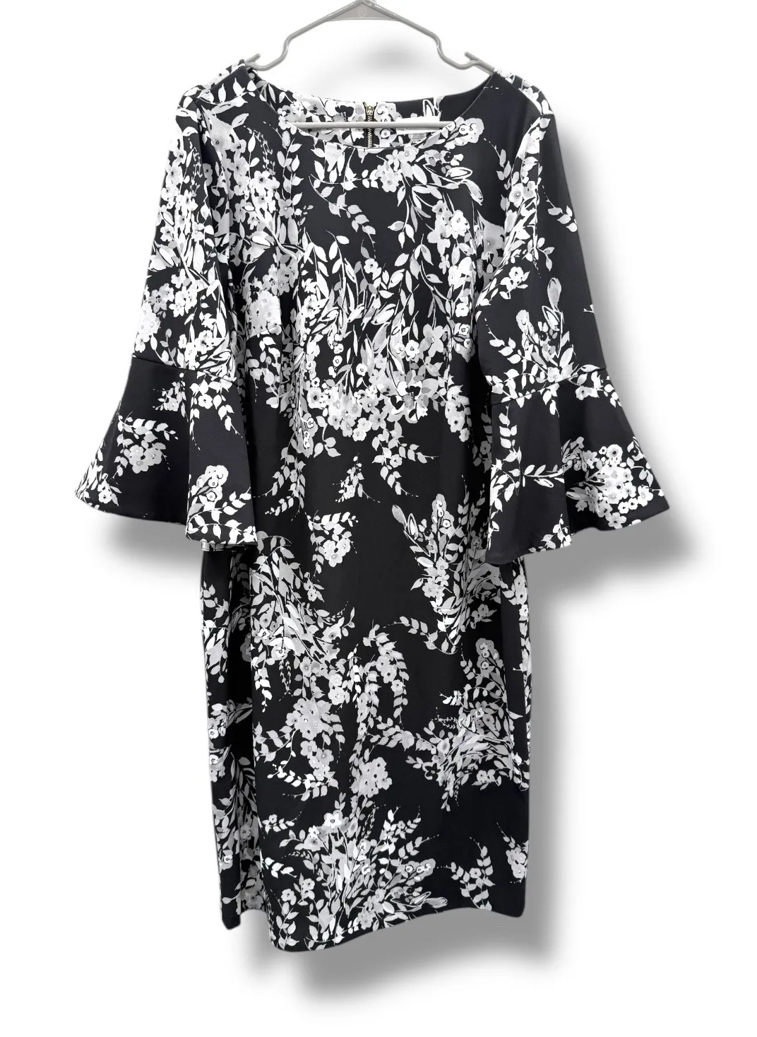 Calvin Klein dress, plus size dress, 16W dress, floral dress, bell sleeve dress, black white dress, knee length dress, work dress, office dress, cocktail dress, formal dress, classic dress, feminine dress, career wear, occasion dress