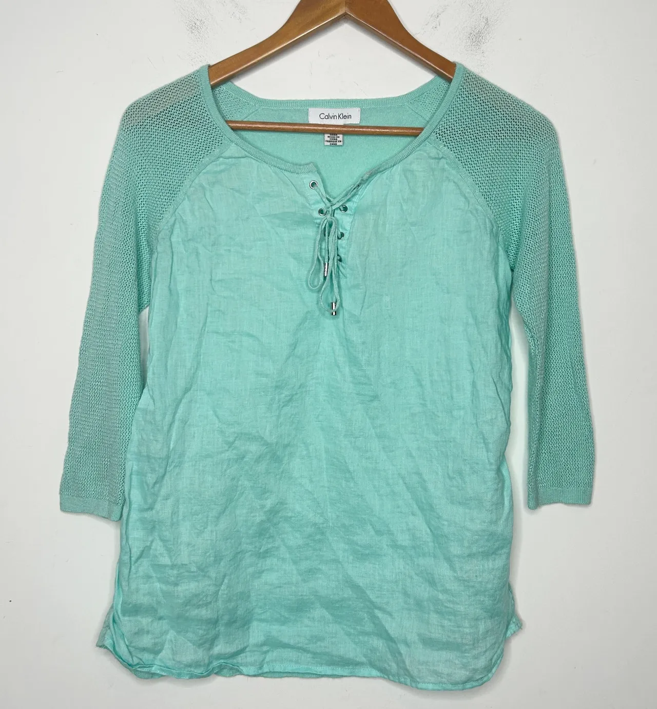 CALVIN KLEIN Linen Top Coastal Beach Vacation Sustainable Chic Womens Size Small Gorgeous teal col... Show more