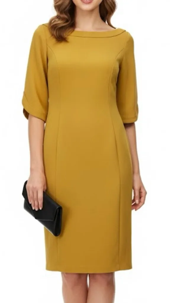 Boat Neck 3/4 Split Sleeve Unlined Exposed gold tone back Zip closure Polyester/spandex Dry Cle... Show more