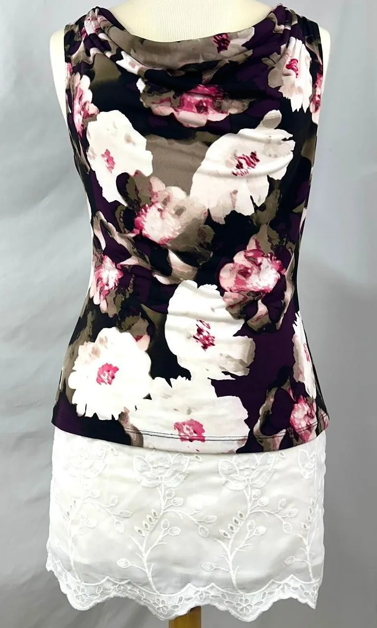 2000s calvin klein white and dark purple floral sleeveless cowl neck tank top, size petite small abs... Show more