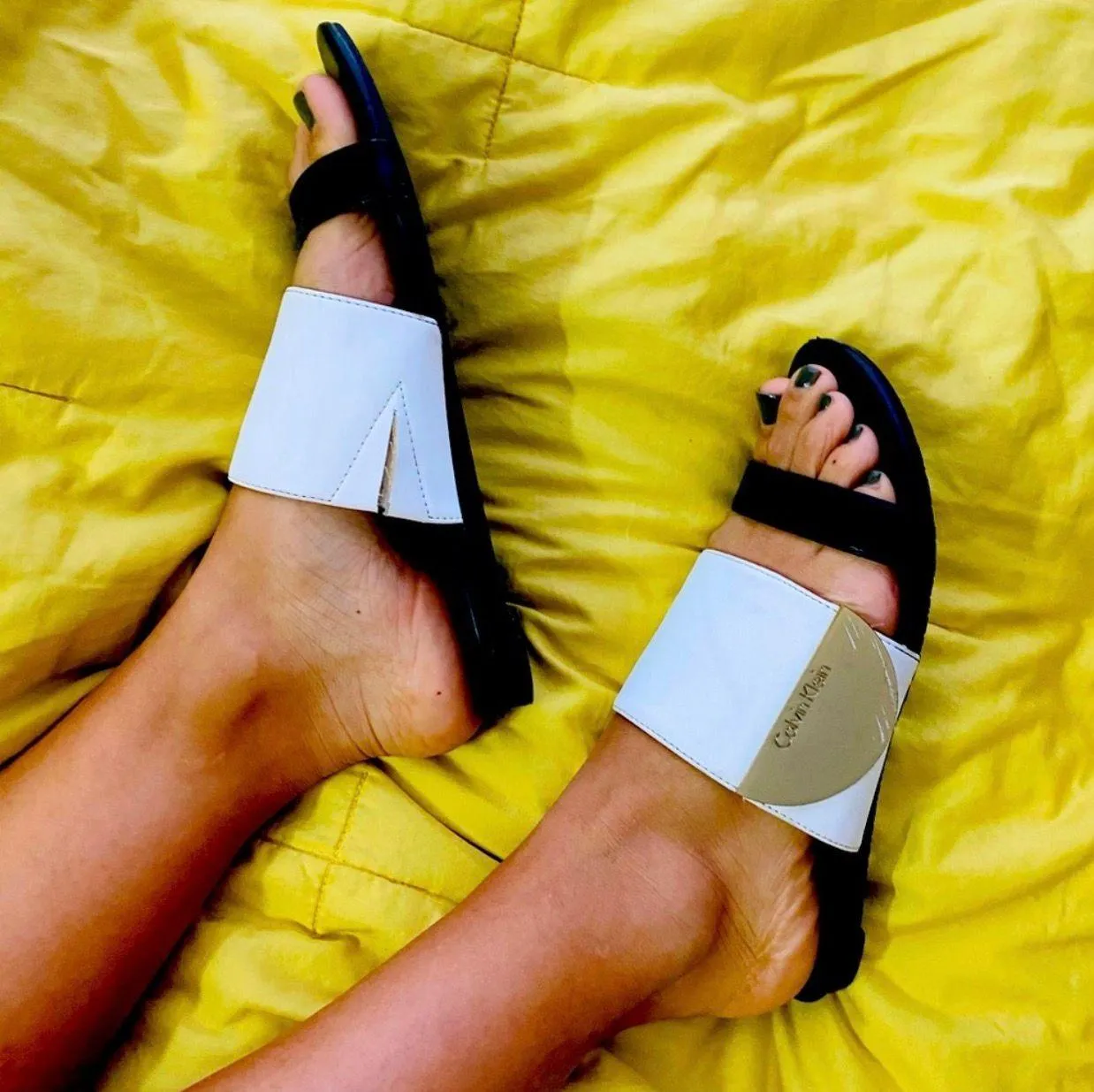 Black and white slippers/ sandals The top band at the toe is black and the other band holding the fe... Show more