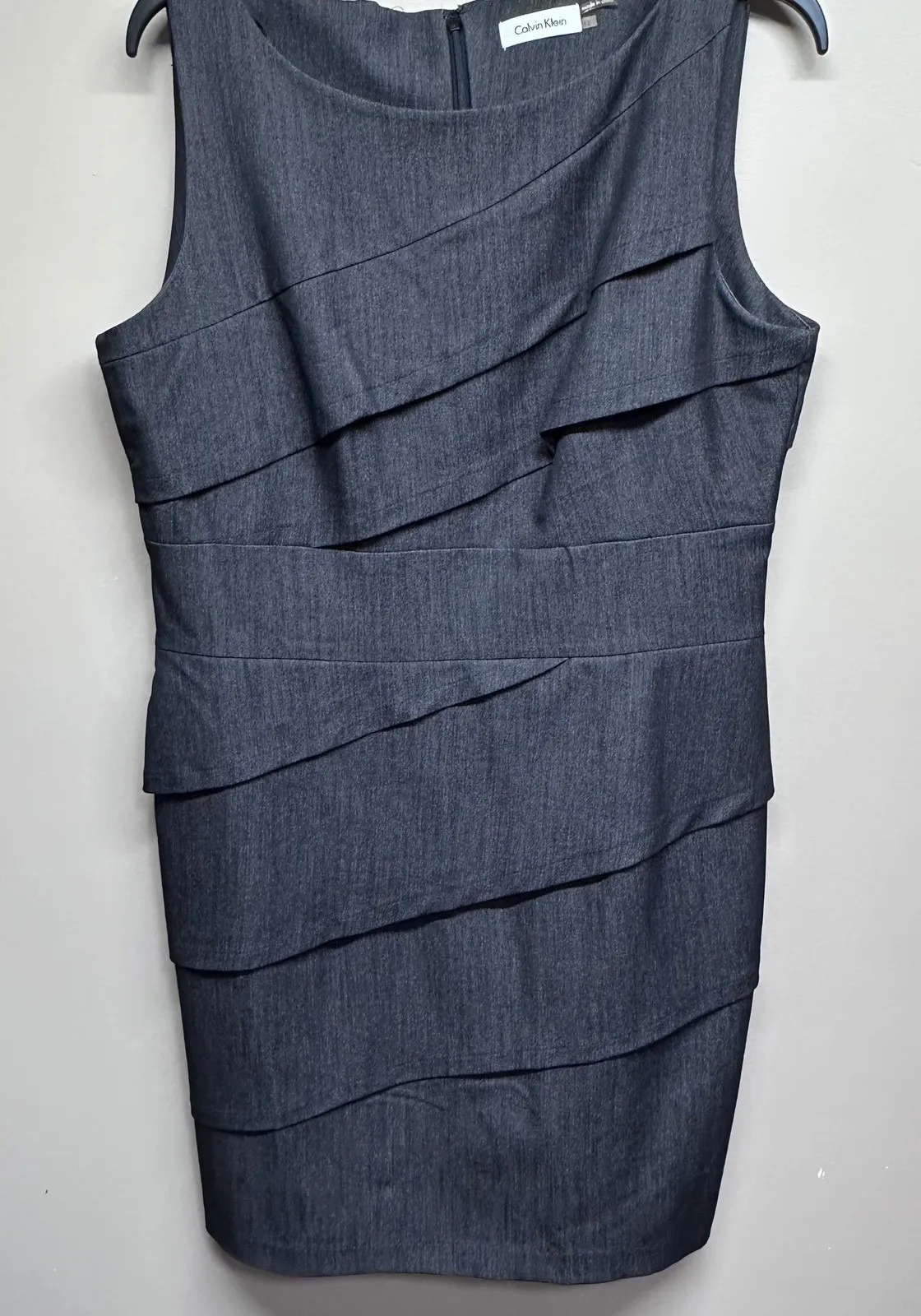 Calvin Klein sheath dress in charcoal gray with a sophisticated tiered ruffle design. Sleeveless sil... Show more