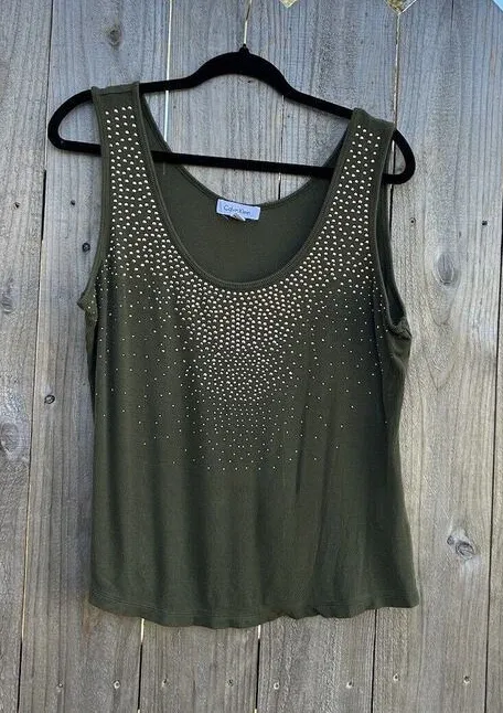 Calvin Klein green tank top size large; preowned good condition! Has gold rhinestone detailing. 95%... Show more