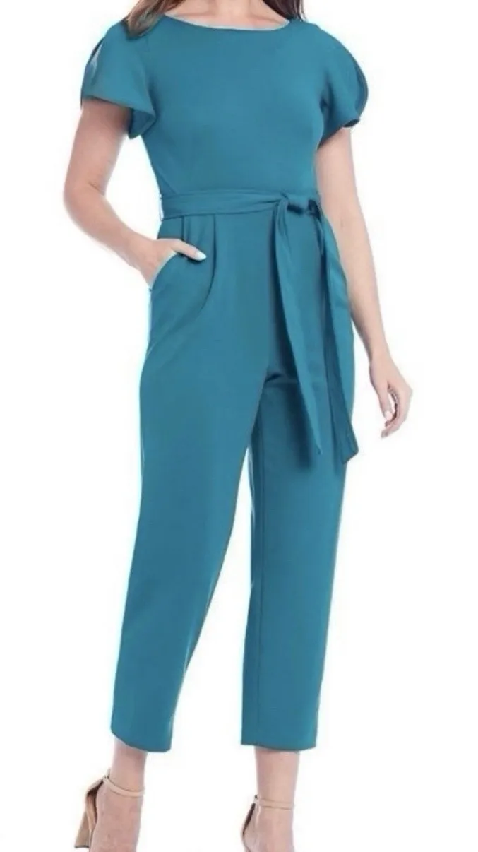 Stretch crepe fabric Tulip sleeves Side pockets Gold tone Back zip closure Self tie belt Polyes... Show more