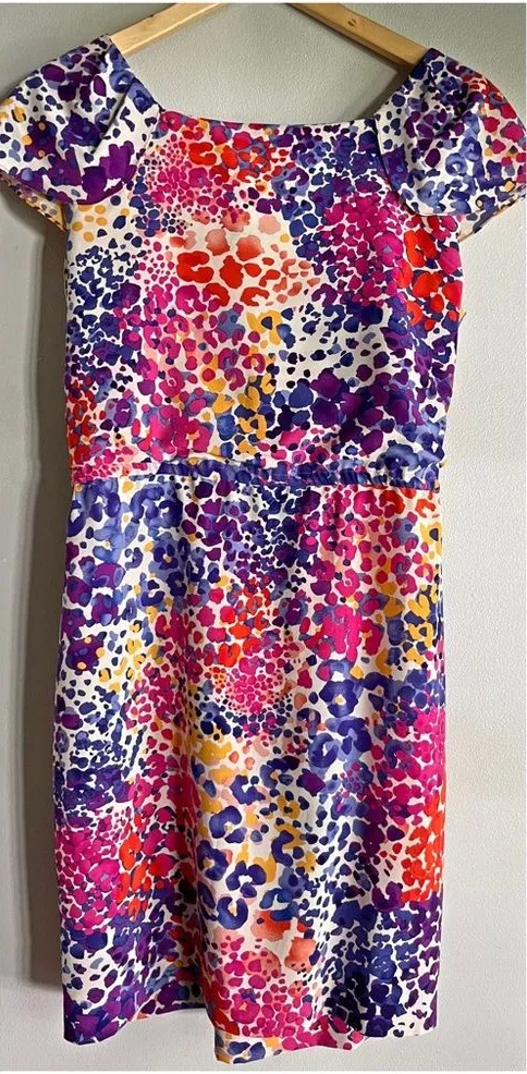 A bold + feminine Calvin Klein dress featuring a vibrant abstract leopard print in pink, purple, ora... Show more