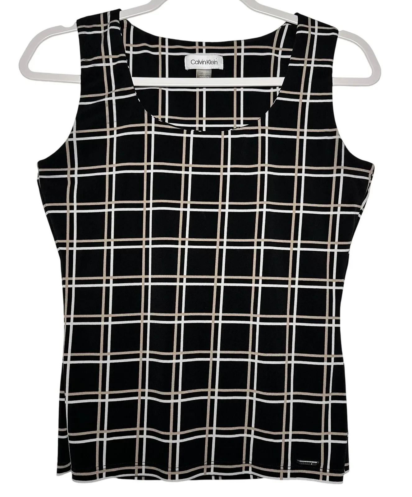 Calvin Klein sleeveless women's tank top in black with a plaid pattern featuring white and tan lines... Show more