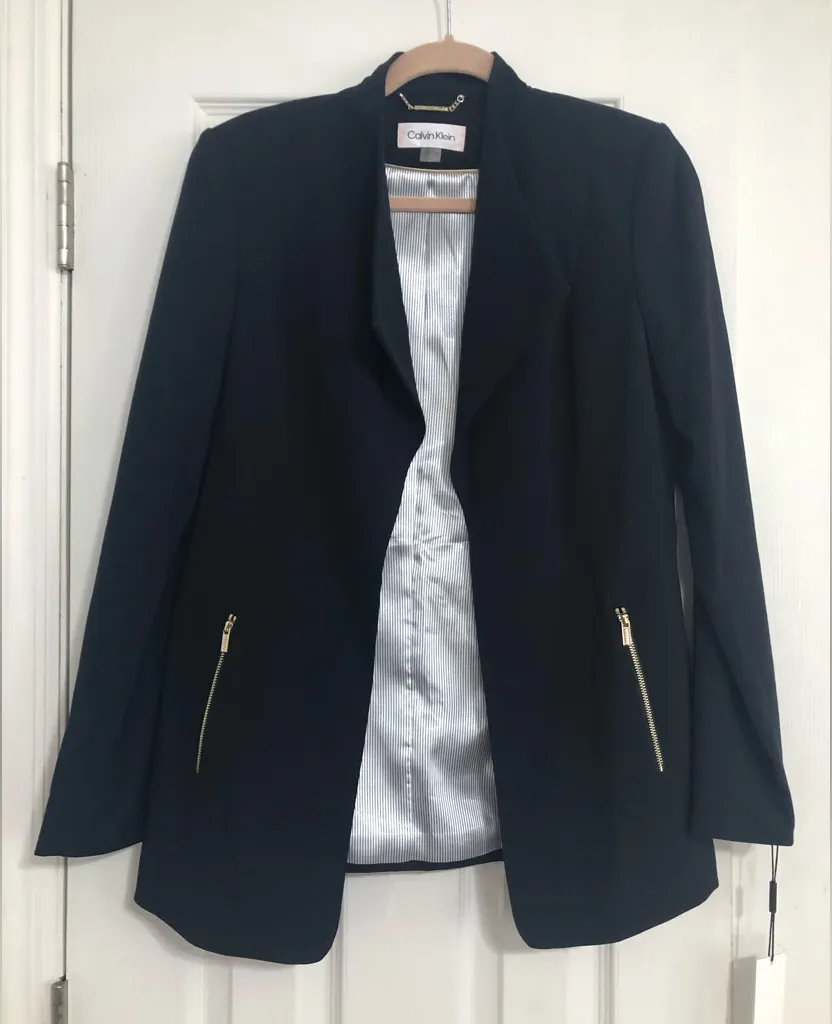 New with tags. NWT Chic navy blazer by Calvin Klein. Features stylish gold zipper pockets. Ideal fo... Show more