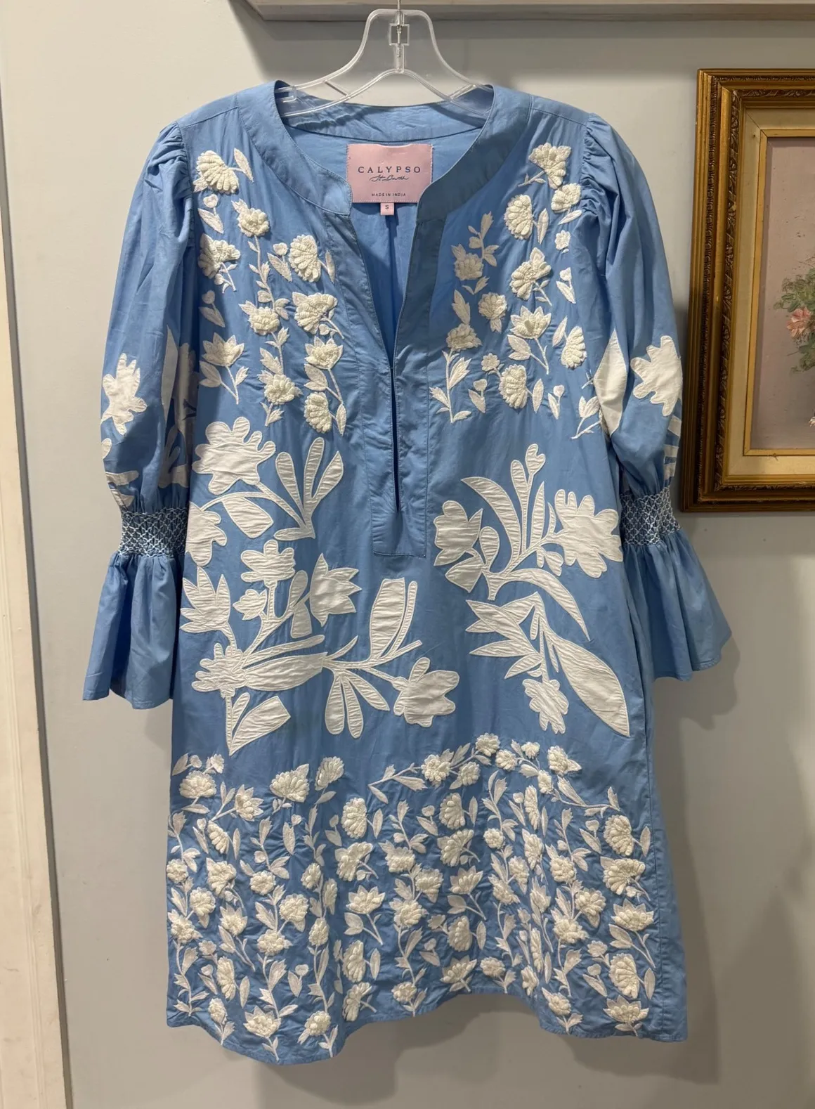 Soft blue Calypso St. Barth embroidered boho dress. 100% organic cotton with dreamy white floral embroidery, puff sleeves + smocked cuffs. Easy, floaty fit—perfect coastal, cottagecore, or resort vibes. Calypso St Barth, boho dress, embroidered tunic, organic cotton dress, coastal chic, cottagecore, resort wear, puff sleeve dress, artisan embroidery, anthropology style, free people vibes