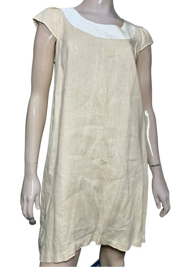 Calypso St Barth’s Women’s Size Medium Tan Beige Linen White Sequin Banded Neck A-Line Mini Dress. S... Show more