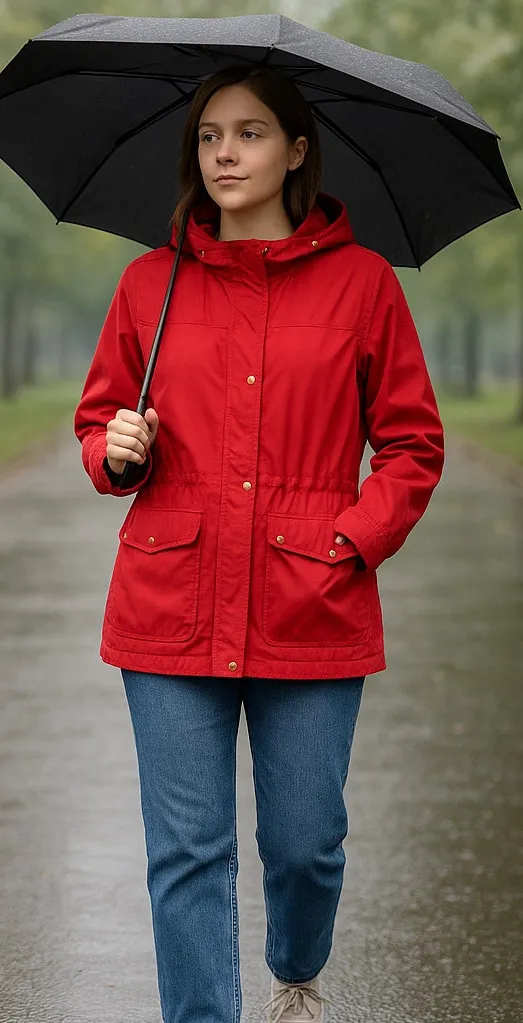 Condition: Excellent pre-owned overall with normal light wear. Detachable hood is missing; snaps for the hood remain. No stains, tears or odors. Zipper and branded gold-tone snaps work smoothly. Please review photos. Distinctively British-inspired Cambridge Dry Goods women’s jacket in a bold red tone with snap storm flap, elasticized waist for shape, and oversized flap pockets. 100% polyester shell makes a lightweight layer that’s great as a travel jacket or everyday windbreaker. Works for city-to-trail gorpcore and capsule wardrobe looks. Keywords for search: utility jacket, anorak, lightweight, water-resistant, windbreaker, travel jacket, field jacket, rain jacket (hood missing), women’s jacket, red jacket.