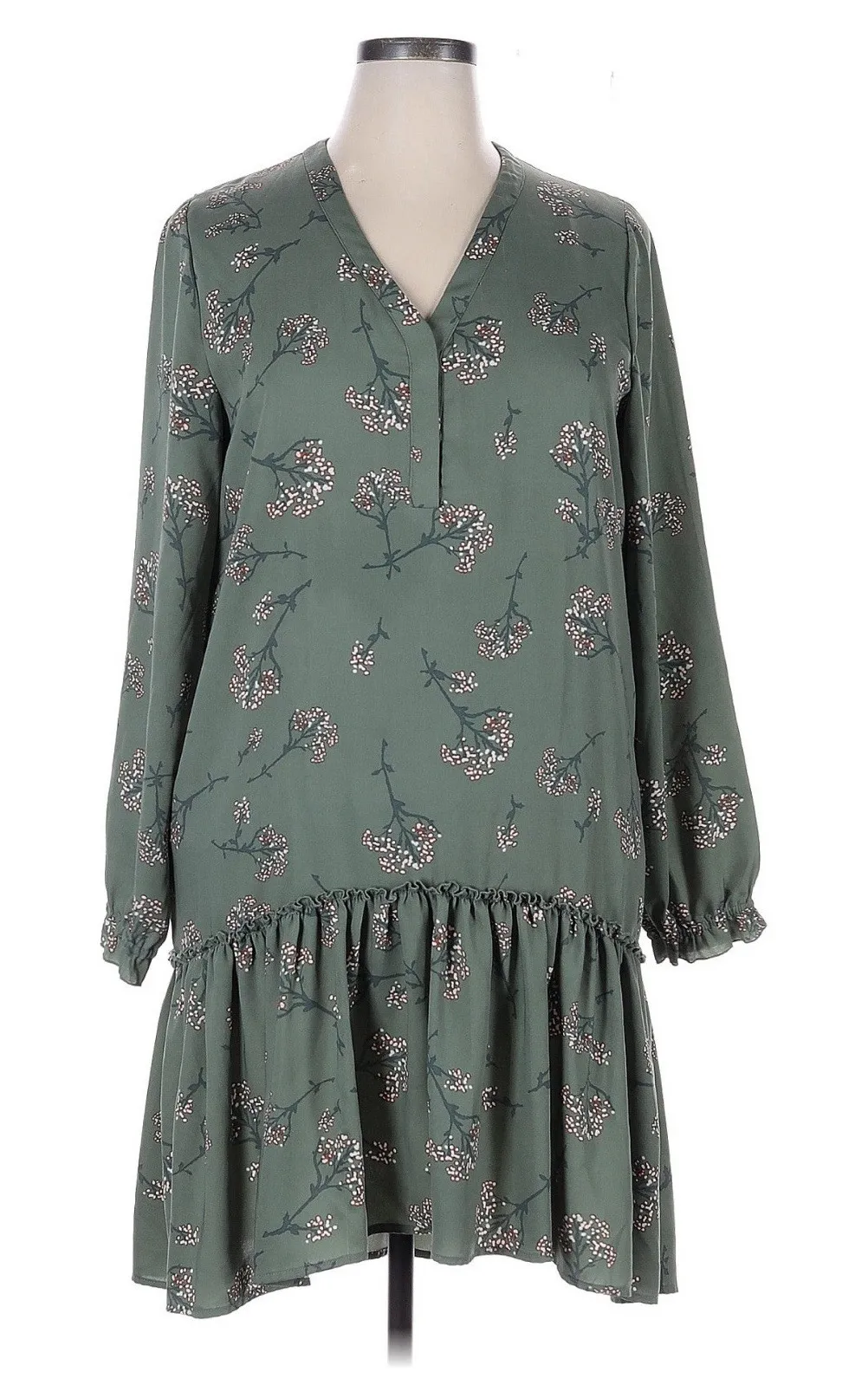 Feminine and breezy, this Camilla Pihl dress features a sage green base with delicate all-over floral print in a soft pink and ivory palette. Designed with a flattering v-neckline, relaxed long sleeves with gathered cuffs, and a drop waist silhouette finished with a ruffled hem. Crafted from 100% double georgette polyester for lightweight movement and subtle texture. Size XL with a total length of approximately 38.75". Details: • Brand: Camilla Pihl • Size: XL • Color: Sage green with pink floral print • Fabric: 100% Double Georgette Polyester • Length: Approx. 38.75" • Features: Drop waist, v-neck, ruffled hem, gathered cuffs • Care: Machine wash cold, gentle cycle Style Tags: Cottagecore, romantic, soft girl, floralcore, vintage-inspired, Scandi chic, feminine, nature aesthetic, garden party Paragraph: Camilla Pihl floral dress, sage green ruffle dress, romantic soft girl aesthetic, vintage-inspired drop waist silhouette, long sleeve floral mini dress, Scandinavian style, garden party dress, spring brunch outfit, 100% double georgette polyester, feminine cottagecore clothing