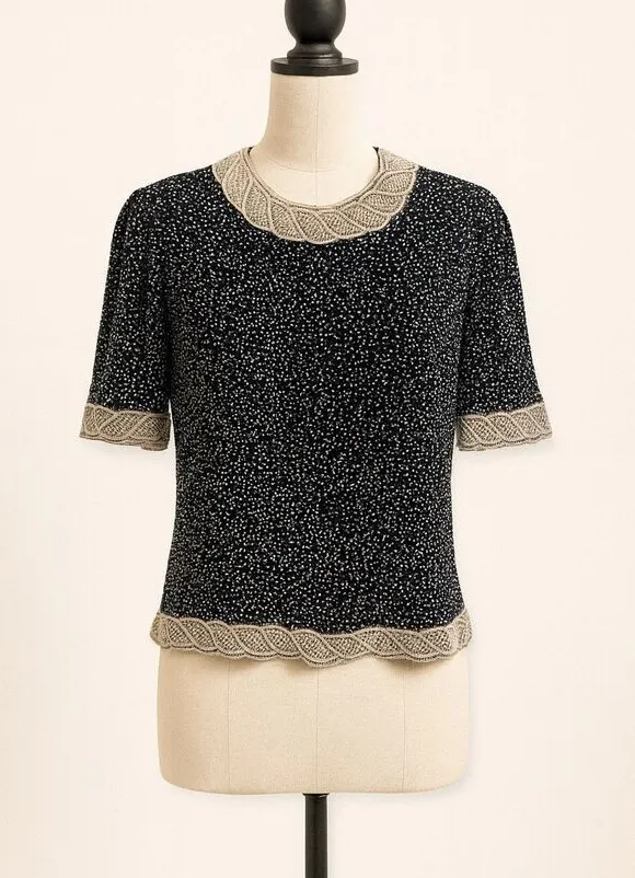 Camille Marie Vintage 100% Silk Beaded Blouse Short Sleeve Black Cream Size M Item Details: • Bran... Show more