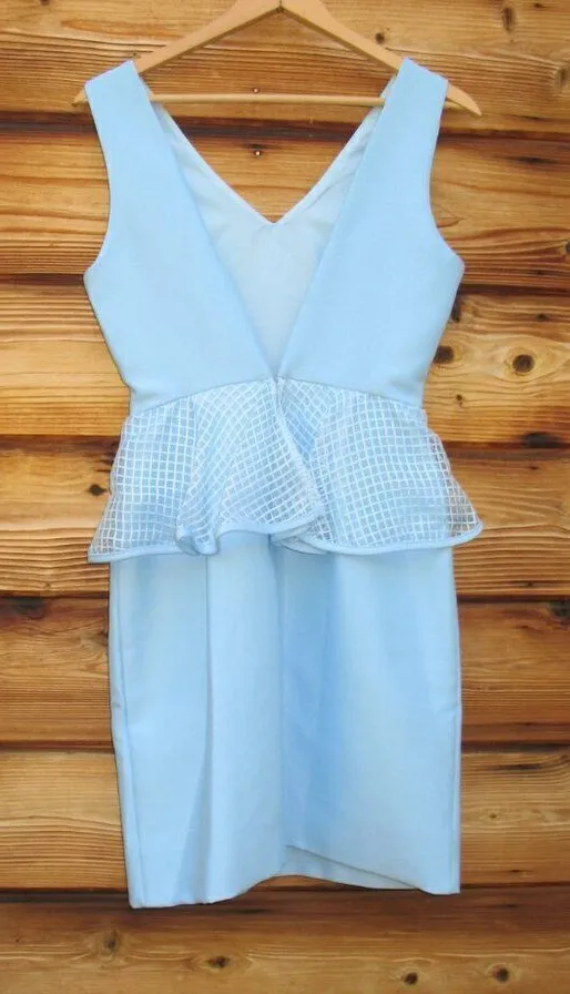 *New without tags. Details: Camilyn Beth Size: 2 Color: Cinderella Blue Back zip closure Deep v back Mesh peplum accent Lined Sleeveless 100% Polyester Approximate Measurements: Length: 35" Bust: 32" Waist: 25"