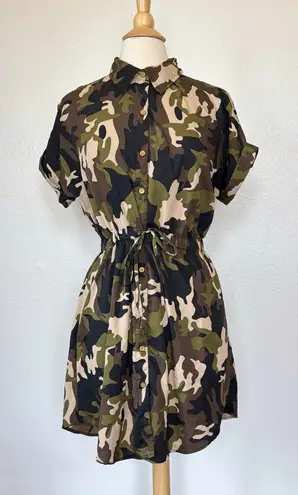 . Size medium. Brand is Speed Control New York. Button front. Cuffed Short sleeve. Elastic waist, faux drawstring. Unlined. Has a couple of runs in designs. 5.1 oz Measurements were taken with the item laying flat across the front: Armpit to armpit: 19” Waist: 14.5” (elastic) Hips: 19” Length: 32”