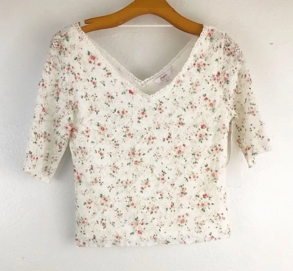 Soft romantic energy. This Candie’s lace baby tee features an allover floral print with a lace overl... Show more