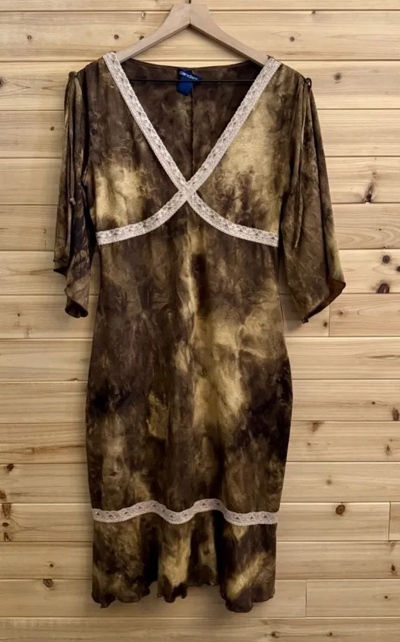 Brown & Tan Tie Dye Style V Neck Lace Trim Relaxed Flutter Sleeve Dress. Size & Material Tag Are Wor... Show more