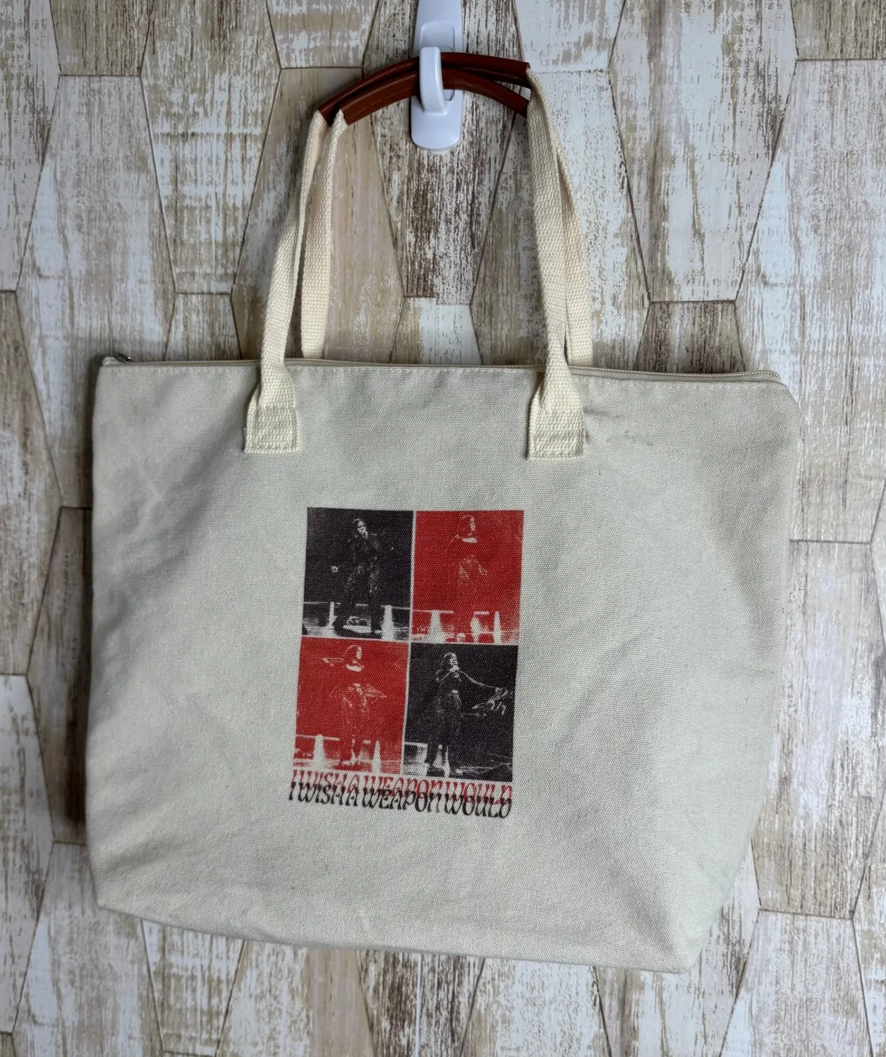 HAS A FEW SILVER MARKING DISCOLORATION, SEE PICTURES Measurements: Bag Width: 16 in Bag Height: 13 in Bag Depth: 4 in Exterior Material: Canvas Style: Tote Exterior Color: Beige Department: Unisex Adults Handle/Strap Material: Canvas Handle/Strap Color: Beige Lining Material: Canvas Hardware Color: Silver Closure: Zip Bag Width: 16 in Bag Height: 13 in Bag Depth: 4 in Theme: Art, Rock Accents: Zipper, Stitching Keywords: graphic tote, canvas bag, zipper closure, everyday bag, casual tote, artist tote, unique print, reusable bag, shopping bag, travel tote