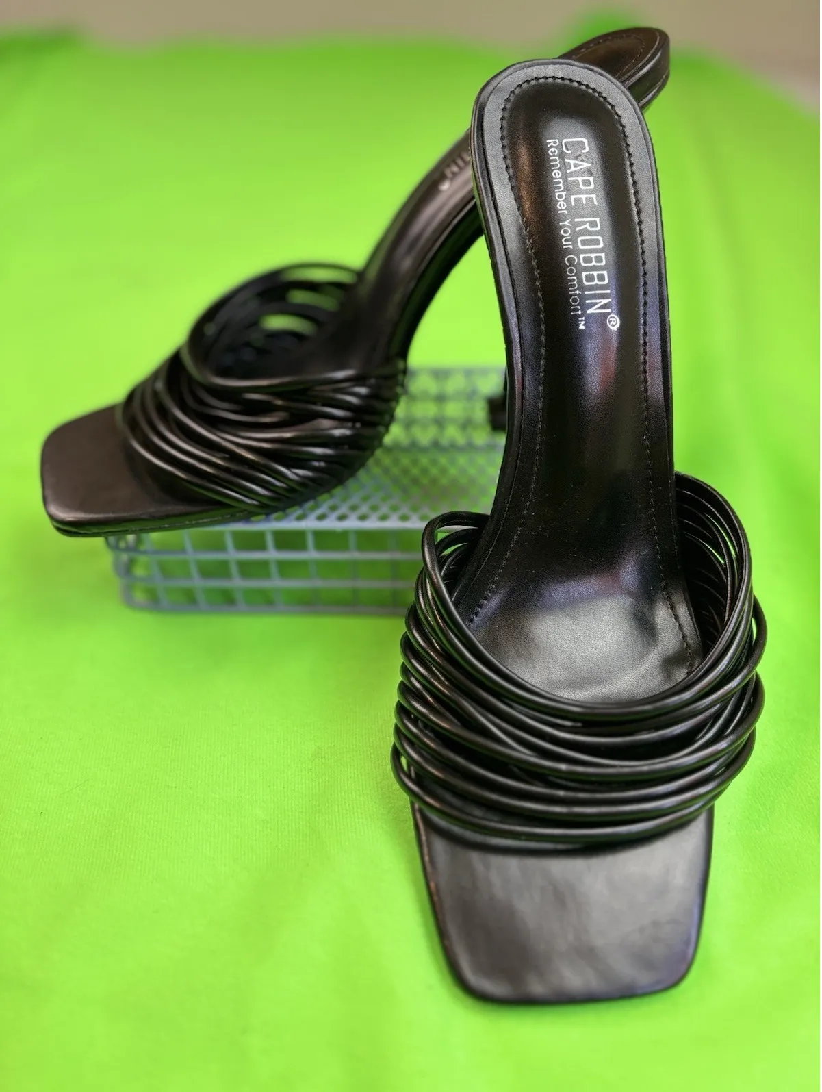 The Cape Robbin Black Strappy Slip On Heels in stiletto size 8.5M are perfect for various occasions such as weddings, parties, and workwear. These ultra-high heels feature a square toe shape and a strappy design, making them stylish and comfortable for the seasons of summer, fall, and spring. With a cushioned, lightweight, and breathable design, these synthetic heels are easy to wear and perfect for going out in style. The black color and solid pattern add a touch of elegance to any outfit, making them a versatile and chic addition to any woman's shoe collection.