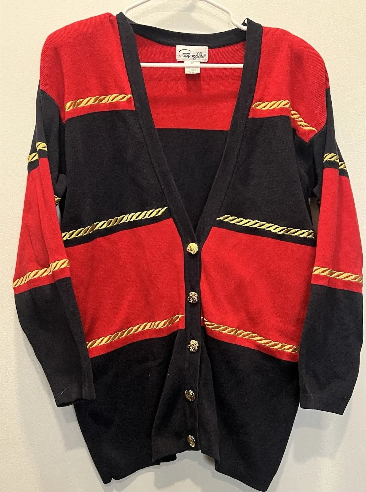 See pic for condition. Small snag/hole in back. Removable shoulder pads. The Cappagallo cardigan is a vintage women's piece from the 80s in a size Medium. This nautical-themed cardigan features a colorful red, blue, and gold design with shoulder pads, perfect for a casual occasion. Made from a knit material, this original piece offers a unique and retro style for those looking to add a touch of vintage flair to their wardrobe.
