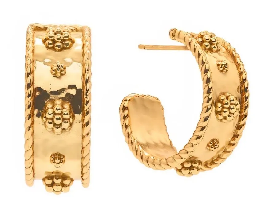 Capucine De Wulf elegant 18 karat gold plated brass hoop earrings featuring an embellishment of beautiful berries and a twisting trim. Lightweight and comfortable for everyday wear or special occasions. Secure closure ensures a snug fit. Size: 0.8" L x 0.8" W x 0.4" H Stamped: CDW with a small pink ruby next to it Most jewelry items are not tested, unless it is specified in the listing that it has been tested, all other items are described only by the stamps and markings, which I am happy to show pictures of.