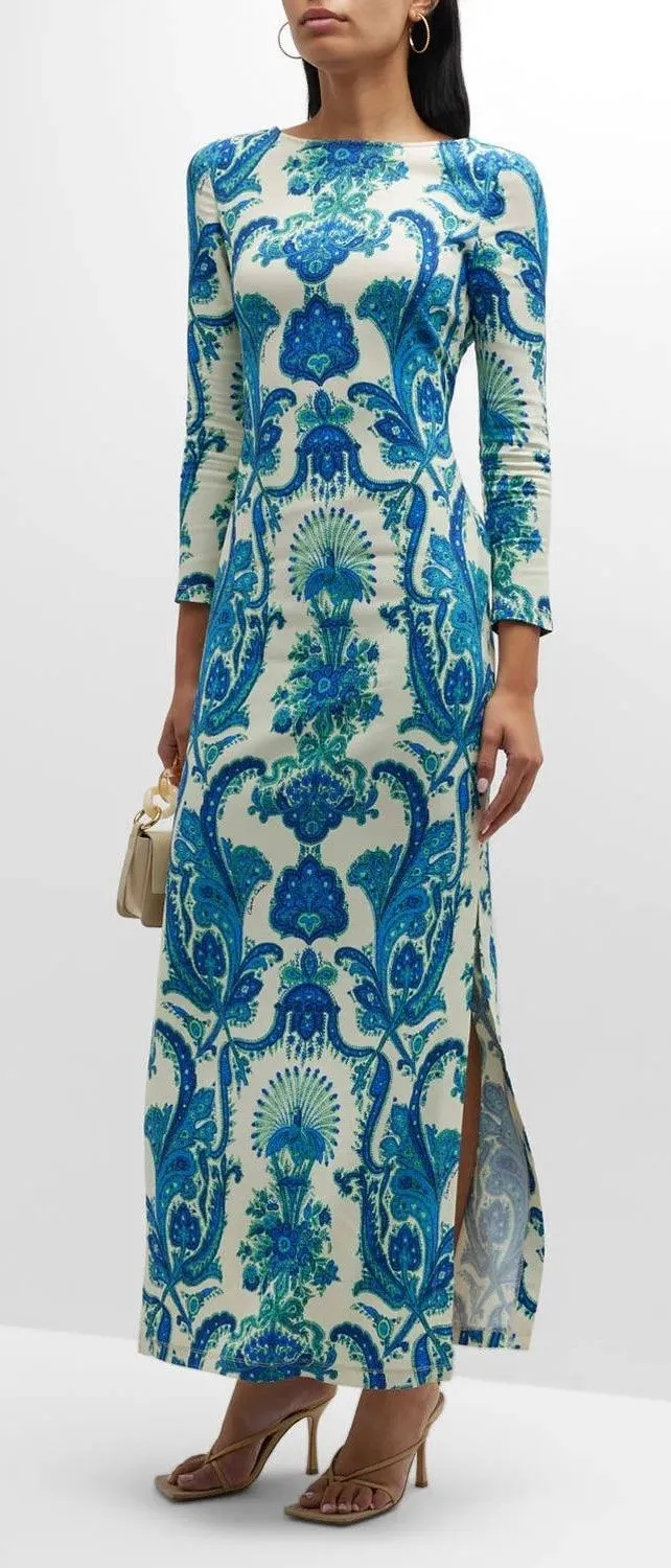 Elegant and vibrant, the Cara Cara Aria Maxi Dress features the brand’s signature peacock-inspired blue and green print on an ivory base. Designed with long sleeves, a flattering column silhouette, and a side slit, this dress transitions beautifully from day to evening. An open back with adjustable tie detail adds a modern, feminine finish. Details • Brand: Cara Cara • Style: Aria Maxi Dress • Size: Large • Color: Ivory with Peacock Blue & Green print • Fabric: Tag missing • Features: Long sleeves, open tie-back, side slit, floor-length silhouette • Condition: Excellent pre-owned, no flaws Approximate Measurements • Pit to pit: 18.5” • Length (shoulder to hem): 57” Perfect for resort wear, vacation dinners, garden parties, weddings, or coastal getaways. Fast shipping from a smoke-free, pet-free home! Keywords: Cara Cara dress, designer maxi dress, resort wear gown, peacock print dress, blue green maxi, wedding guest dress
