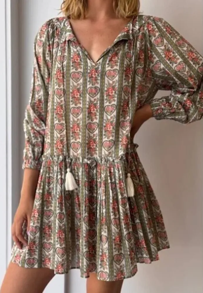 Cara Cara Kavita Dress in Sweetheart Multi Sz. S Measures: 34"L,20" armpit x armpit Retails $395 Excellent condition! The Kavita Dress in our sweetheart print is a carefree, relaxed piece with bracelet sleeves and a tassel tie neck. Relaxed fit Tasseled neckline Unlined Slip on 100% Cotton Voile