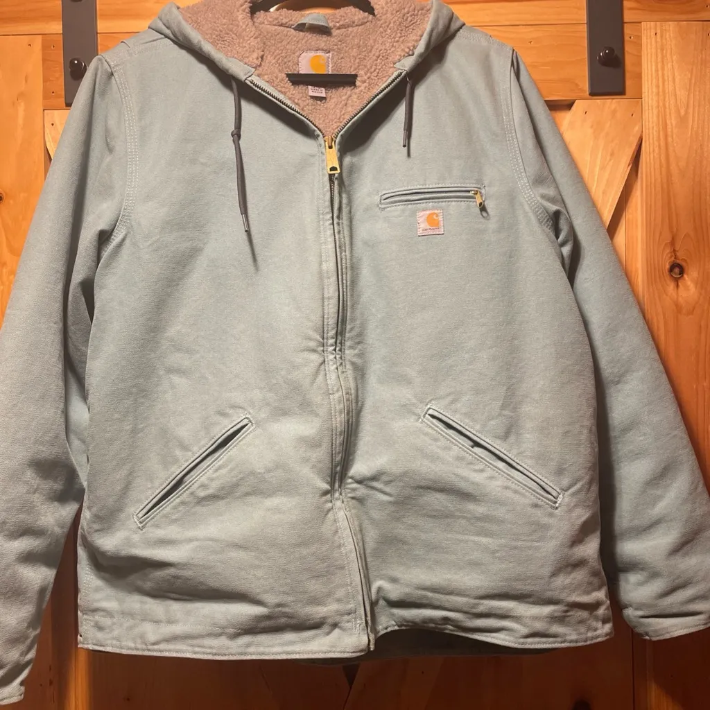 Seafoam green hooded jacket with front zipper and pockets. Features Carhartt logo on chest. Sherpa f... Show more
