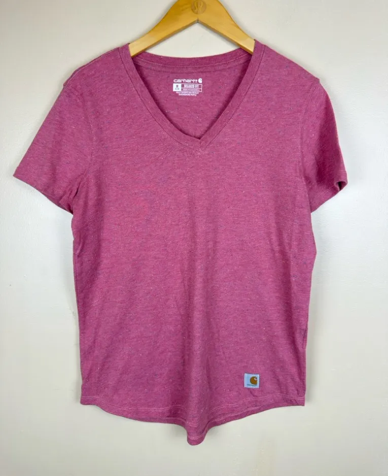 Carhartt Women’s T‑Shirt, size M, relaxed fit, pink color, featuring “Hardworking People” slogan. Co... Show more
