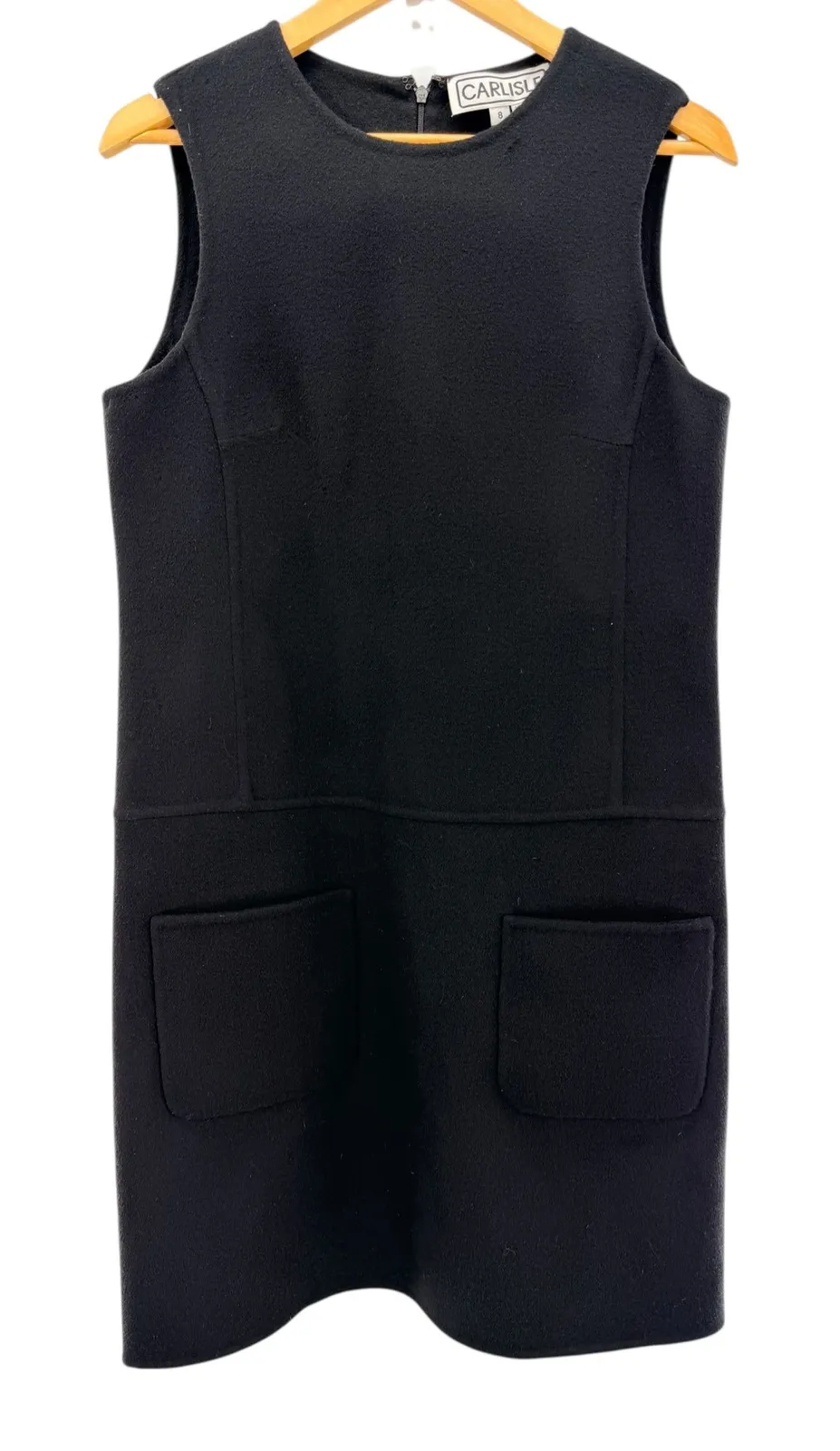 Timeless and tailored, this Carlisle sleeveless shift dress delivers elevated minimalist elegance with a clean, architectural silhouette. Crafted in a structured wool blend, this piece features subtle seaming, a streamlined cut, and discreet front patch pockets for a refined yet functional finish. Perfect for workwear, layering, or elevated everyday styling. Please note: there are small areas of wear/holes on the back layer only (see photos). The outer structure remains intact, and the dress presents beautifully from the front. Details: Brand: Carlisle Size: 8 Color: Black Sleeveless, structured silhouette Back zipper closure Front patch pockets Lined interior Classic, minimalist design Condition: Pre-owned. Minor wear on back fabric layer only (see photos). Priced accordingly. Fabric: Wool blend tag removed Care: Dry clean recommended Measurements (approx.): Pit to pit: 19" Length: 39" Minimalist • Quiet Luxury • Modern Classic • Workwear Chic • Tailored • Capsule Wardrobe • Elevated Basics • Office Core • Slow Fashion • Timeless Black Dress