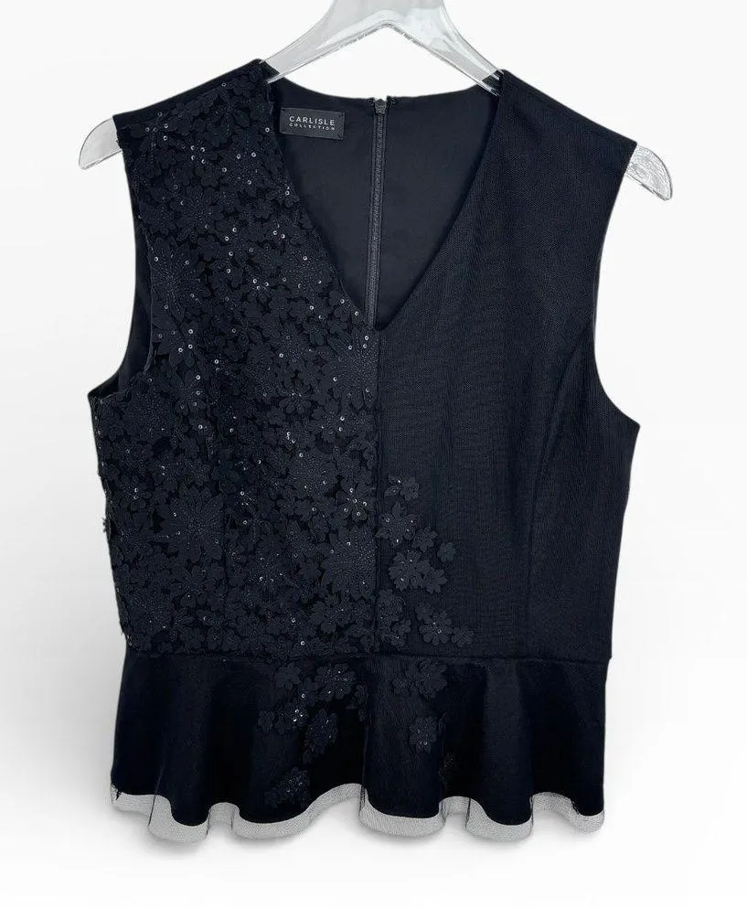 Carlisle blouse women's 8 floral applique mesh overlay peplum V neck tank black - $46 - From Baldi