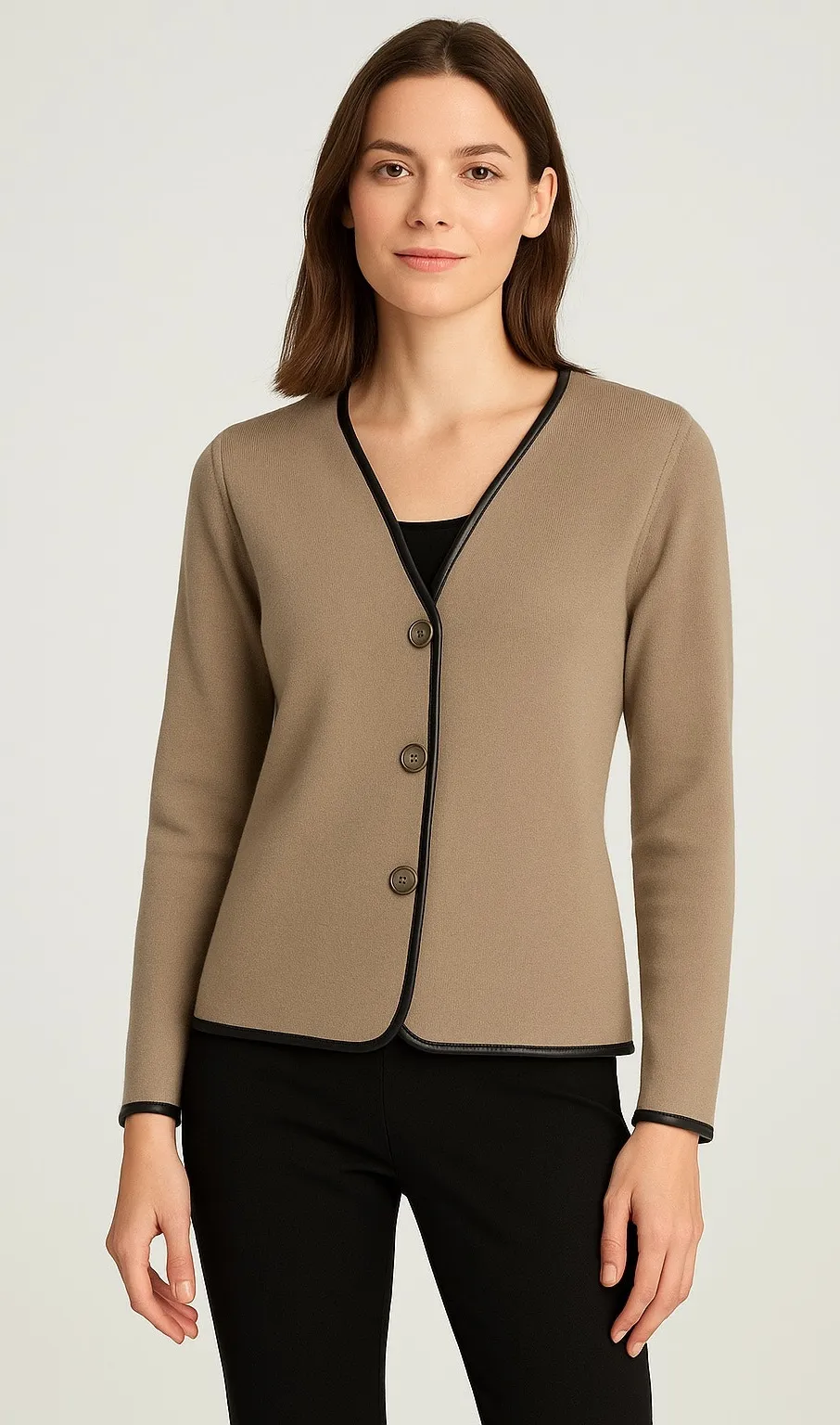 Sophisticated and timeless, this Carlisle merino wool knit jacket blends structure with softness. Designed in a neutral taupe-beige with sleek black faux-leather trim, it features a minimalist collarless neckline, button-front closure, and subtle stretch for a flattering silhouette. Made from a luxe merino wool blend for lightweight warmth and polish. Details • Size: Small • Color: Taupe with black trim • Material: 78% Merino Wool, 19% Nylon, 3% Spandex • Trim: 70% Polyester, 30% Polyurethane • Button-front closure • Collarless neckline • Approx. length: 22.5” • Pit to Pit: 18” • Made in China quiet luxury, minimalist, classic neutral, modern officewear, tailored knit, elegant chic, capsule wardrobe, preppy polish Condition: Excellent pre-owned condition — clean fabric, no flaws noted.